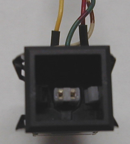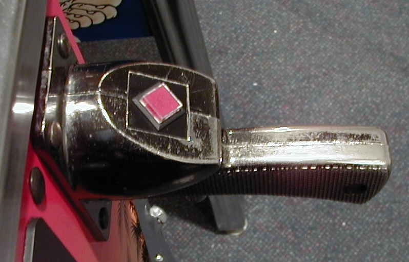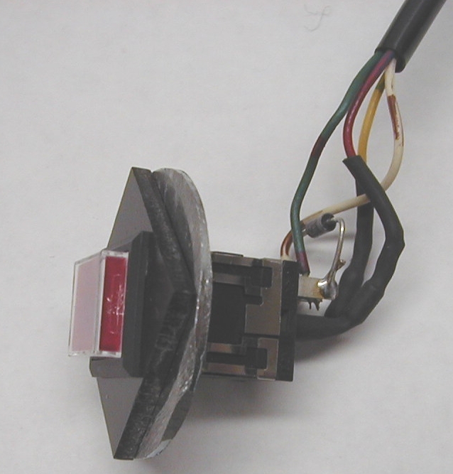 The electronic parts are available from Mouser Electronics; I've added Mouser part numbers in parentheses. As far as tools go, the only specialized tool is a T-25 security Torx bit. Sears sells a set of six security Torx bits (stock number 9-25702) for less than $10. You'll need a crimp tool for the Molex male terminals, a soldering iron, solder, a wire cutters, and a needle-nose pliers. A drill press, drill bits, and coping saw will be required to cut the mounting hole for the switch in the fender washer and black plastic. Step 1 - Remove the Handle AssemblyTurn the power off, remove the lock-down bar, the playfield glass, the balls, and raise the playfield to lean against the head. Disconnect the wire harness that leads to the handle assembly. Remove the four carriage bolts that secure the handle assembly to the cabinet (you'll need a 3/8-inch nut driver and a 3/8-inch box wrench). Step 2 - Disassemble the Handle AssemblyRemove the T-25 security Torx screws that join the two halves of the handle assembly. The existing push button switch assembly can be removed by pulling it from the slots inside the handle assembly. Keep the original switch assembly in case you want to remove the illuminated push button assembly some day. Step 3 - Fabricate the Switch Plate and BezelThis is probably the toughest step. You'll need to cut a 0.622-inch (5/8-inch is close enough) square hole in the fender washer and the piece of black plastic. If you have access to a 5/8-inch square hole punch you'll be able to make a really nice cutout with minimal effort. If you don't have the hole punch, and don't want to spend $20 to buy one, the alternative is to mark a 5/8-inch square centered on both pieces, drill pilot holes in the corners, and use a small coping saw with a metal-cutting blade to make the cutout. Note that the cutout in the plastic piece is 45 degrees offset from the sides of the plastic piece: The switch has a small bezel surrounding the body that will hide some amount of sloppiness in the cutout. Spend a bit of extra time on the cutout in the plastic piece, since that's the one that will be most visible. Now test-fit the fender washer and plastic bezel in the two halves of the handle. If your fender washer is a little too thick you may have to use a bench grinder to thin out the surface of the washer near the edges, or flatten the edges a bit so the two halves of the handle fit together correctly. Be sure the fender washer and plastic bezel fit correctly and the cutout in each piece matches so you won't have problems when you complete the assembly. Step 4 - Wire the Push Button SwitchThe push button switch wiring isn't complicated, but be careful to connect the wires to the correct terminals. Use a low-wattage soldering iron when making the connections to the switch to avoid damage from over-heating. Use this diagram to locate where the various connections are made (this is a rear view of the switch):