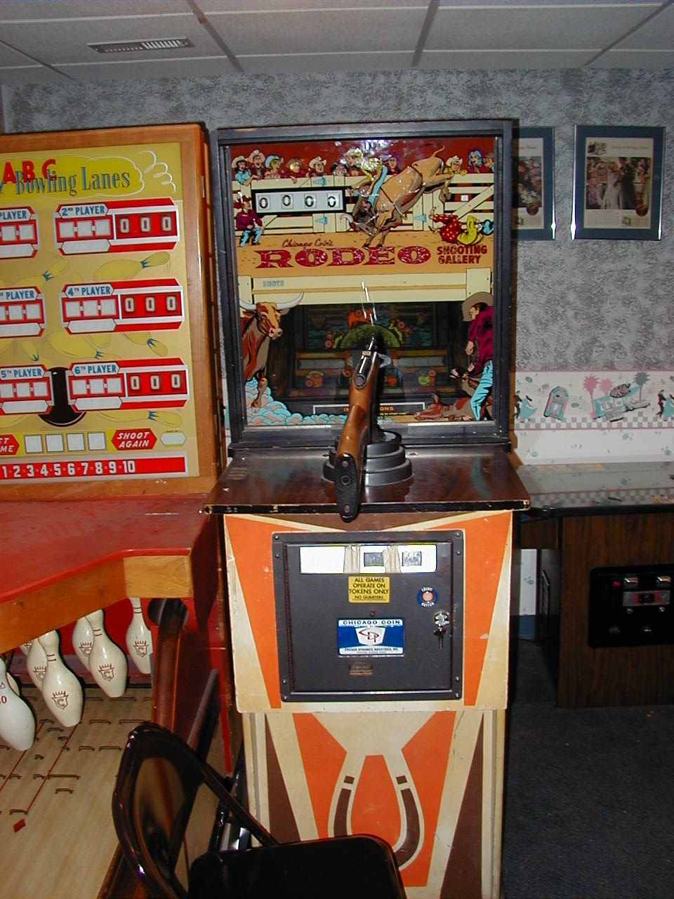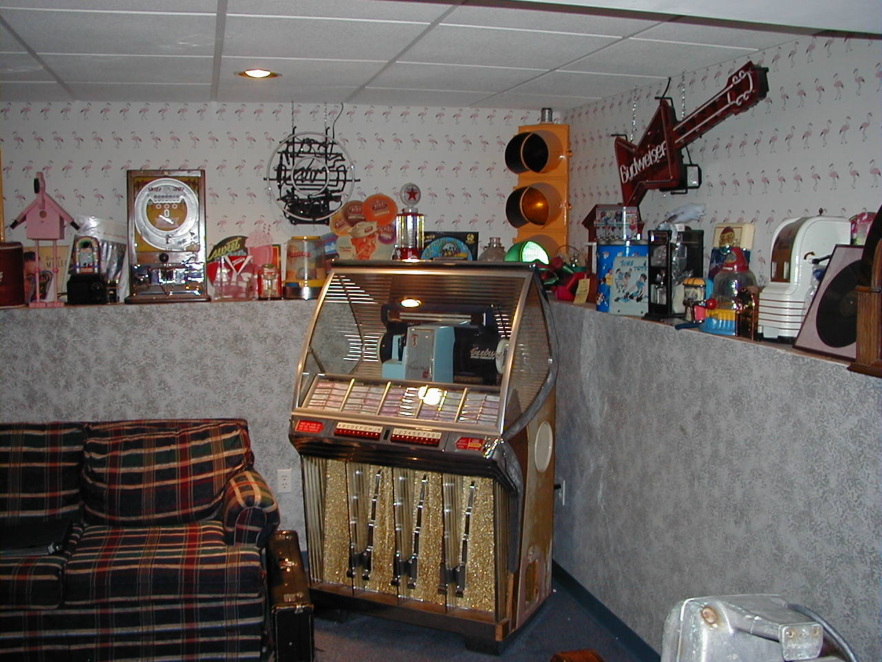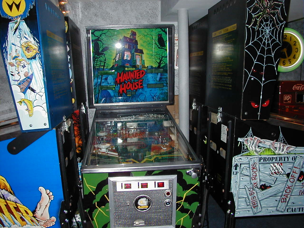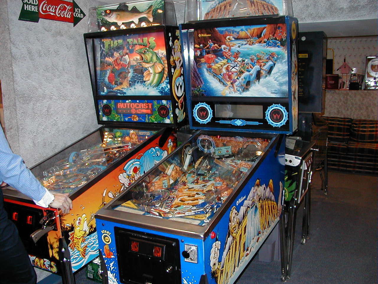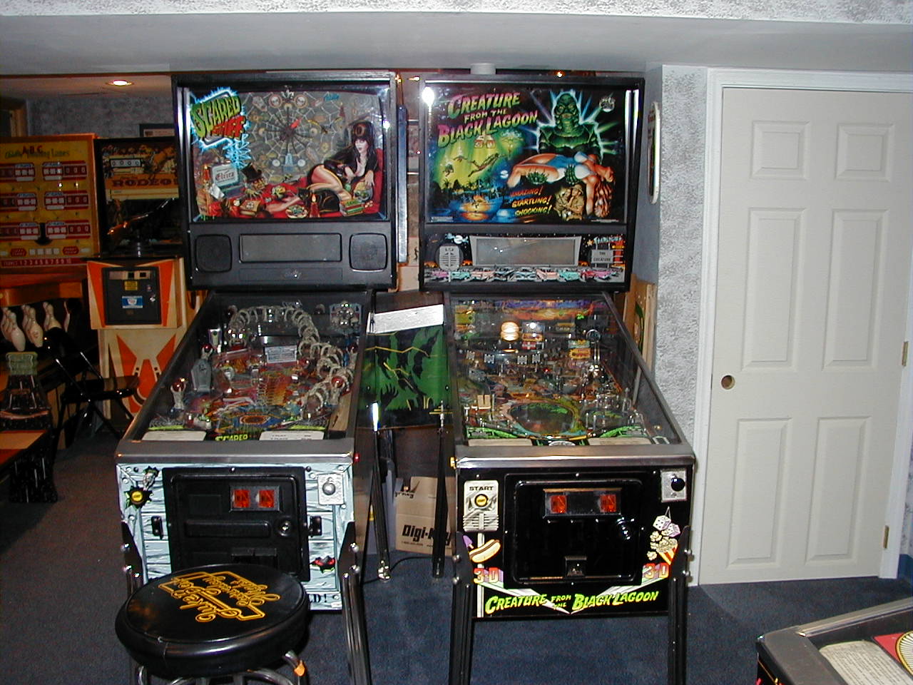 I'm a fairly serious collector of coin-operated arcade equipment. There's probably a better word than "serious" for a person who owns ten pinball machines, but we'll leave that to your imagination ... My primary interest is mid- to late-nineties pinball machines, but my collection also includes several juke boxes, a few rifle games (shooting galleries), and a HUGE ball bowler machine. If you're a fellow collector or enthusiast in the area of Nashua NH, I'd love to hear from you. I've been working on coin-op games for several decades and can assist you with repairs to your games. Here are some pictures of my basement arcade. Click on any of the thumbnails below for a larger picture. Some notes about these games: