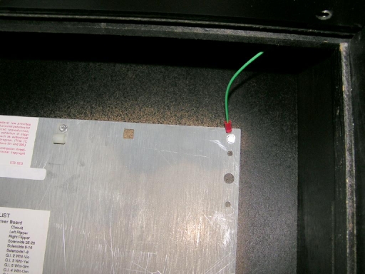 Metal Speaker Panel Speaker ReplacementSafety tip: Be sure to disconnect the power to the game before performing any work! In order to replace the speakers the speaker panel must be removed from the game. Hint: In the sections below you'll need to find the center of a square. It's very easy to do this by drawing diagonal lines from each corner of the square to the opposite corner using a straight edge and a pencil. The point where the two lines intersect to form an "X" is the center of the square. Safety tip: Wear eye protection when using power tools! A dust mask will come in handy for the operations that generate lots of dust. Remove the Speaker PanelRemove the back glass and set it in a safe location. Open the insert panel and remove the hex-head sheet metal screw from the upper right corner of the metal panel in the back box to free the green ground wire leading to the speaker panel.