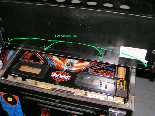 Raise the back box back to the upright position and fasten the setup latch. While holding the speaker panel in place, remove the four tamper-resistant Torx T-20 screws that fasten the panel to the wooden rail that spans the upper part of the back box. The panel assembly is heavy, so be careful that it doesn't come crashing down on the playfield glass!