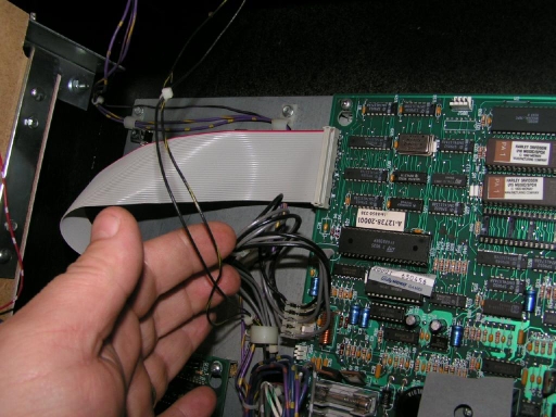 Follow the black and black-yellow wires from the left speaker into the back box to identify the specific connector on the sound board, and then remove that connector from the board (the wires run from the left rear of the metal speaker panel to a cable clamp on the left of the sound board, and then along the bottom edge of the sound board).