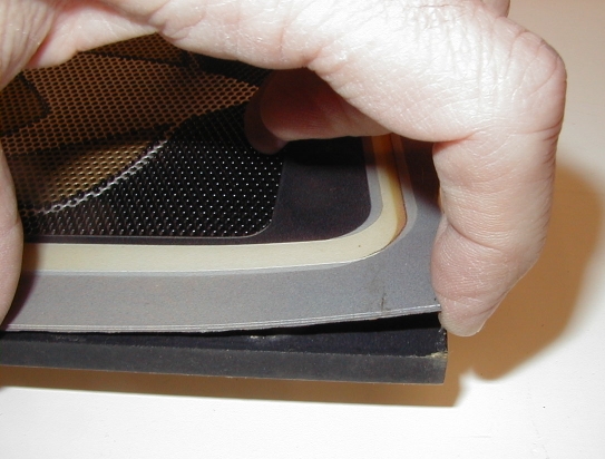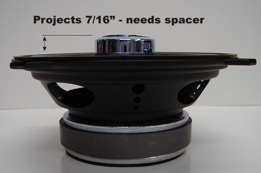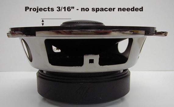 Tap the original T-nuts into place in the recesses with a hammer. If you removed the display mounting studs replace those and tap them into place with a hammer. Use flat black paint to paint the areas of exposed wood around the new speaker cutout; bare wood will be visible through the metal speaker grille. If any of the paint on the front surface of the display panel was pulled off when you removed the screened plastic panel be sure to paint the front surface of the display panel too. Check if You Will Need SpacersGrab one of your 6-1/2 inch replacement speakers and set it on the magnet end so the tweeter is facing upward. Carefully lay a flat metal ruler or straight edge across the outside edge of the speaker next to the tweeter. Measure the distance from the bottom of the ruler or straight edge to the top surface of the tweeter. If this distance is more than 5/16 inch you'll need to fabricate spacers for each side of the display panel. For example, the tweeter on this speaker projects 7/16 inch - it will need a spacer: The tweeter on this speaker projects 3/16 inch - it will not need a spacer: If you don't need spacers skip to the section on assembling the display panel. If you do need spacers, you may be able to use the ones that are typically included in the box with the speakers; you'll probably have to do quite a bit of surgery with a saw to get them to fit. You may prefer to simply fabricate spacers instead. Fabricate SpacersThe spacers are fabricated from 1/4 or 3/8 inch thick MDF board; the thickness used depends on the front projection of the tweeter. Measure the projection of the tweeter (see above) and subtract 1/4 inch. If the remainder is less than 1/4 inch you can use 1/4 inch thick MDF board; if the remainder is more than 1/4 inch you'll need to use 3/8 inch thick MDF board. Here is a diagram of the spacer that we're going to fabricate: