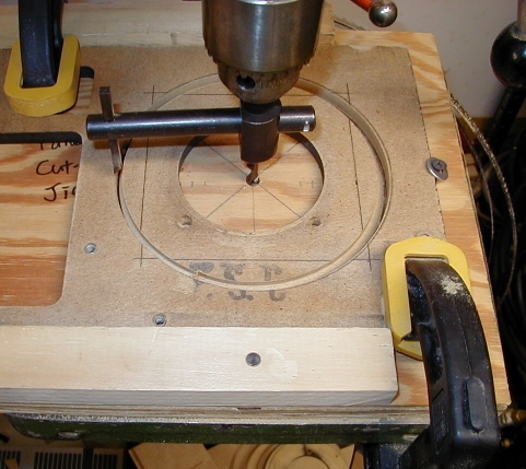 If you're using a circle cutter adjust it to make a 5-5/8 inch diameter hole. Securely clamp the display panel to the table of the drill press before starting the drill press! Position the pilot bit where the two diagonal lines intersect and slowly advance the circle cutter until it has cut through the entire thickness of the board. Stop as soon as the cutout section of MDF board starts to spin around with the circle cutter bit.