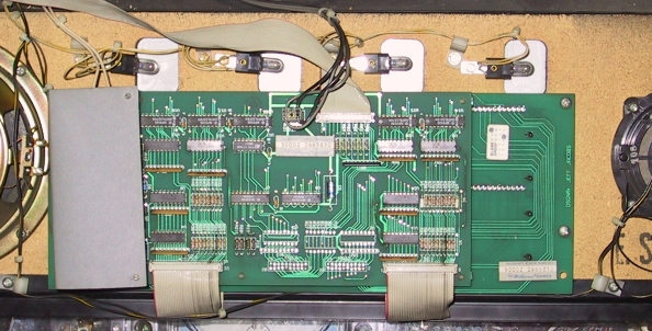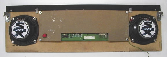Remove the four screws that fasten the alphanumeric display board to the wooden display panel, and then remove the display board (note that the left two mounting screws are hidden by the insulating paper in this picture). Store the display board face down on a towel or other padded material. Set the mounting hardware aside for later re-use. Remove the four screws that mount each speaker to the display panel, and then remove each speaker. The left speaker will have one green-yellow ground wires fastened under the lower screw closest to the left edge of the panel; save that for later re-installation. The U-channel on the top edge of the display is made of either metal or plastic; if it's metal there will be a short green-yellow jumper wire from the speaker mounting screw to the left-most screw that fastens the U-channel to the panel.