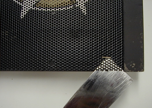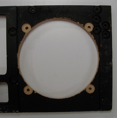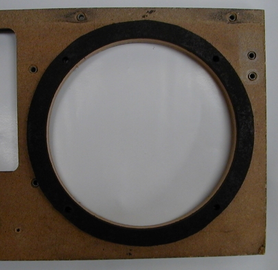Place the spacer in position on the rear of the display panel and verify that the holes you drilled line up with the T-nuts inserted in the display panel. You may want to thread the four mounting screws originally used for the left speaker through the holes in the spacer to be sure the holes will line up properly when you mount the speaker. You may also want to temporarily re-attach the J-shaped hooks that mount the speaker panel to the back box rails to be sure the spacer clears the hooks. You may need to trim the spacer to clear the corner of the hooks. After you've verified the fit of the spacer you should paint it with flat black paint so it blends with the display panel (when seen from the front side of the panel). The completed spacer should look like this when placed in position on the display panel: