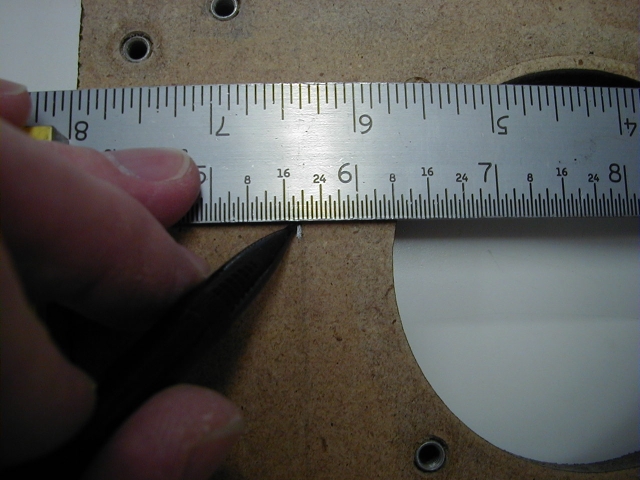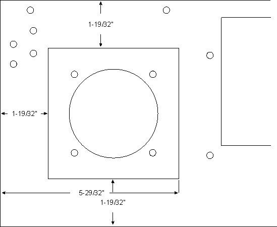 Take extra pains to position the layout lines exactly as specified; most of the 6-1/2 inch speakers I've used don't have elongated mounting holes for the mounting hardware, so you need to be very accurate when marking and drilling the new mounting holes. You will get the best results when you locate the mounting holes by using the measurements described below. However, you could use the "center finder" template described a few paragraphs down the page; place the template on the rear surface of the wooden display panel, line up the edges, and use an awl or a sharp nail to make marks where the four mounting holes will be drilled. If you use the template be sure to double-check the positions of the marks by measuring as described below. Using a combination square make a mark on the rear of the wooden display panel above the existing cutout 1-19/32 inch from the top edge of the panel. Make another mark below the existing speaker cutout 1-19/32 from the bottom edge of the panel.