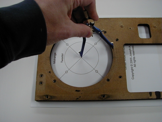 Double-check your layout by placing the original 6 inch speaker on the rear of the display panel so the four speaker mounting holes are located at the four corners of the square; if your measurements were correct you should be able to see the corners of the square centered in each speaker mounting hole. If you can't position the speaker so the four mounting holes line up with the four corners of the square, double-check the placement of the horizontal and vertical lines. Once you've verified your measurements drill 7/32 inch diameter holes at the four corners of the square; use a brad-point drill bit so you can position the bit exactly at each corner. Now we have to locate the center of the new cutout for the new speaker. To help I've created a "center finder" template that you can use. Click here to open the template in your browser, and then select the File -> Print menu item. Be sure the "page scaling" option is set to "none" so the template prints in the exact original size. Note: You must have Adobe® Reader® installed on your computer to view or print this file. Adobe® Reader® is available for free download on Adobe's Web Site. *CHECK FAKE TEMPLATE DIMENSIONS* (If you're unable to print the template it's pretty easy to make your own simplified version. Cut a piece of stiff cardboard 7-1/2 inches square. Draw a diagonal line from each corner; the point where the lines intersect to form an "X" is the center of the square. Using a compass draw a 2-7/8 inch circle centered on the "X". Now cut a 1/2 inch wide strip off one end of the template. When properly positioned the circle on the template will line up with the existing cutout in the panel, and the diagonal lines should line up with the new mounting holes you just drilled.) Slide the template under the display panel and align the three outer lines with the outside edges of the display panel. When properly aligned the smaller circle should be centered on the existing cutout, the new mounting holes you just drilled should line up with the circles on the dotted diagonal lines, and the four circles outside the smaller circle should line up with the original speaker mounting holes. Use some masking tape to fasten the template to the bottom of the display panel once you're satisfied with the alignment.