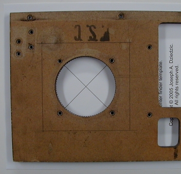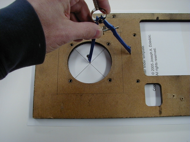 Note: You may want to use a 1/4 inch brad-point drill bit to make a pilot hole before using the circle cutter; the pilot bit on the circle cutter is a standard drill bit that is a little tough to align exactly even with the center lines on the template. If you're using a jig or sabre saw, use a compass to mark a 5-5/8 inch diameter circle on the rear of the display panel; put the compass point on the "X" on the center-finder template. The circle you drew should be exactly centered around the outside of the existing cutout; once you've verified the position of the new circle remove the template.