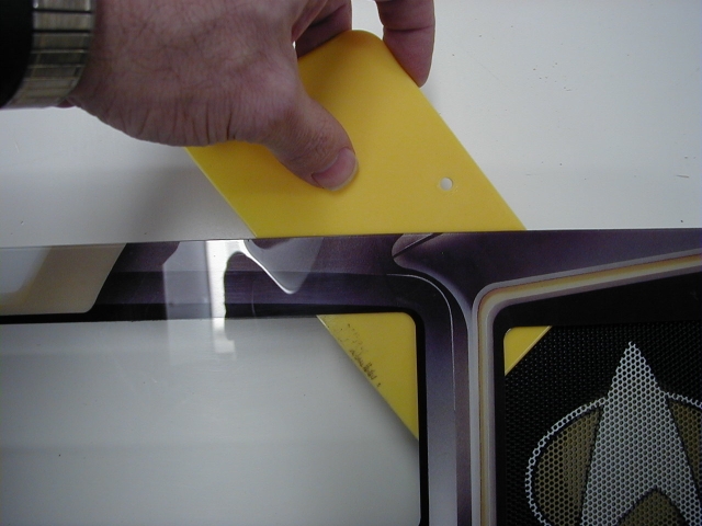 Remove Mounting HardwareRemove the two screws that mount the two J-shaped hooks used to mount the top of the display panel to the rails inside the back box, and set the screws and hooks aside. Remove the four screws that mount the metal or plastic U-channel to the top of the display panel, and set the screws and U-channel aside. Note that the inner two screws have small cable clamps on them; don't lose the clamps. Remove Screened Plastic PanelNote: The illustrations in this section are from a dot matrix display panel. The screened plastic panel on an alphanumeric display is removed in the same manner. Now comes the tricky part: removing the screened plastic panel from the front of the wooden display panel. The plastic panel is fastened to the wooden panel by double-sided foam tape that usually has lost much of its stickiness, but you may have to gently pry the plastic panel to peel it away from the wooden panel. Do not use any kind of sharp object such as a screwdriver, putty knife, or scraper; pry only with your fingers! Don't use a heat gun on the plastic panel, as it may deform the panel. If you start at one corner and maintain gentle pressure the adhesive should break free; some times quite easily, and some times it will be a real struggle. Take your time and don't bend the plastic panel too sharply; if you crease the plastic it's almost impossible to remove the crease. If the adhesive is hanging on for dear life there are a couple of things to try. First, put the entire display panel in a refrigerator for about 20 minutes; the cold can make the adhesive less sticky. If that fails, try using a hair dryer set on the lowest heat level and warm the stubborn area of the panel; don't leave the heat on any one spot too long, and don't use a paint stripping heat gun - it will produce too much heat. Finally, if all else fails, you may have to resort to using a plastic scraper to help cut through the adhesive. The kind sold for use with auto body putty is ideal: soft enough not to damage the screening on the plastic panel, but stiff enough to cut through the adhesive. The trick is to maintain gentle, even pressure until the adhesive bonds break. Don't force it, don't rush it, and be extra careful! Set the plastic panel in a safe place once it is free from the display panel. Remove Speaker GrillesThe metal speaker grilles on the display panel are held in place by small nails or staples near the four corners of each speaker grille. Insert a flat putty knife between the speaker grille and the panel and gently pry up the corners of each grille; the nail or staple should pull out of the wooden panel without too much force. Be careful that you don't pry too hard and consequently bend or distort the speaker grilles! Also be careful that you don't lose the nails or staples while prying; they have a tendency to pop out. Remove Speaker Mounting HardwareThread one of the longer speaker mounting screws a few turns into one of the four T-nuts around the smaller cutout in the display panel, and then tap the screw head with a hammer; the T-nut should pop right out. Repeat for the remaining T-nuts. Set the T-nuts and screw aside for re-use later.