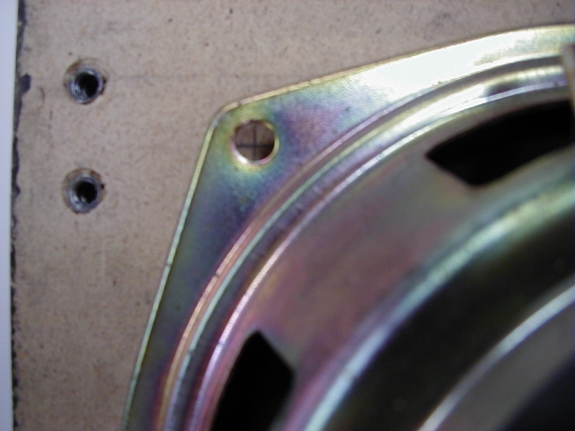 Drill a pilot hole for the saw blade just inside the circle, and then carefully cut along the line using the jig or sabre saw. Use a fine-toothed wood cutting blade so the cutout edges are smooth, and favor the inside edge of the line when cutting so the cutout isn't too large. Take your time and try to make the cutout as close to a perfect circle as you can. Working from the front side of the display panel (the side with the recesses for the speaker grilles) use a Forstner bit to drill a 5/8 inch diameter recess centered on each of the 7/32 inch holes you just drilled. Don't drill too deep! The recess only needs to be as deep as the round metal "head" of the T-nut; about 1/16 inch is usually deep enough. Look at the recessed holes for the T-nuts that mount the other speaker; you'll want to match that depth. If you don't make the recesses deep enough the T-nuts will rattle and buzz against the rear side of the metal speaker grilles. If you don't have a drill press you can use a router with a flat bottom bit to make the recesses. Here's a picture of the completed modifications to the right side speaker cutout as viewed from the front side of the display panel: