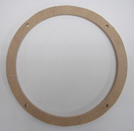 Cut a piece of MDF board 6-1/2 inches square. A table saw is the best tool for this job; if you don't have a table saw you can use a portable circular saw. You can also have your local lumber dealer cut some pieces of MDF board to size for you. MDF board is relatively inexpensive, and it usually costs an extra quarter or fifty cents per cut for the lumber dealer to cut the MDF board to size. Draw diagonal lines from each corner of the board to its opposite corner; the point where the two lines intersect to form an "X" is the center of the board. Make marks on each diagonal line 3-1/16 inch from the center of the square (four marks total). The screws that mount the speaker to the display panel will pass through holes at these points. Use a compass to mark a 6-1/2 inch diameter circle centered on the board; we will trim the spacer along this line later. If you're using a circle cutter adjust it to cut a 5-5/8 inch diameter circle. Be sure to securely clamp the MDF board to the table of the drill press before starting the drill press! Position the pilot bit where the two diagonal lines intersect and slowly advance the circle cutter until it has cut through the entire thickness of the board. Stop as soon as the cutout section of MDF board starts to spin around with the circle cutter bit. Note: You may want to use a 1/4 inch brad-point drill bit to make a pilot hole before using the circle cutter; the pilot bit on the circle cutter is a standard drill bit that is a little tough to align exactly even with the center lines on the template. If you're using a jig or sabre saw, use a compass to mark a 5-5/8 inch diameter circle centered on the board. Drill a pilot hole for the saw blade just inside the circle, and then carefully cut along the line using the jig or sabre saw. Use a fine-toothed wood cutting blade so the cutout edges are smooth, and favor the inside edge of the line when cutting so the cutout isn't too large. Take your time and try to make the cutout as close to a perfect circle as you can. Drill 3/16 inch diameter holes at the four points marked on the two diagonal lines. Use a jig or sabre saw to carefully cut just to the outside of the larger circle marked on the spacer. There is very little clearance around the sides of the speaker frame so it is necessary to cut the spacer to precisely match the diameter of the speaker frame. Here's what the spacer should look like when you're done drilling and cutting: